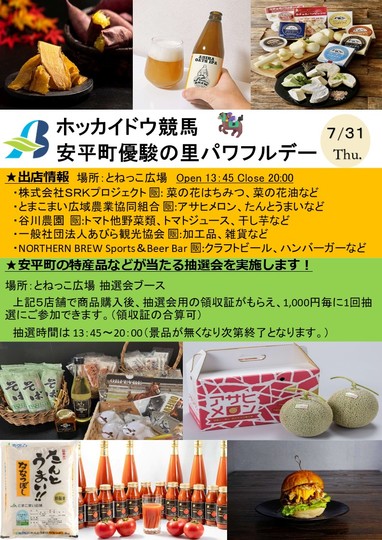 「優駿の里」として知られる安平町の協賛イベント『安平町優駿の里パワフルデー』を開催いたします。当日は、安平町に由来した名前の競走を予定しています。また、とねっこ広場において下記のとおりブース出店および抽選会を実施いたしますので、ぜひ門別競馬場にご来場ください。