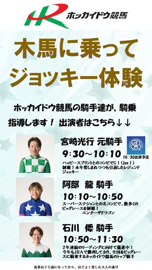 馬のお仕事体験のプログラムとして実施される「木馬に乗ってジョッキー体験」にホッカイドウ競馬の騎手