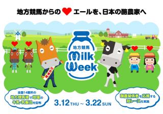 地方競馬では、3月12日(木)から22日(日)までの11日間を「地方競馬ミルクウィーク」と題し、牛乳・乳製品の消費拡大につながるPR活動を通じて日本の酪農を応援する取組を実施します。